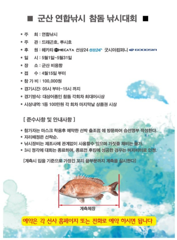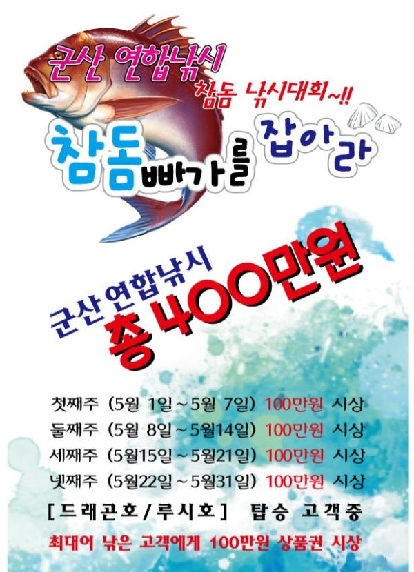 ![]() ![]() ![]() ![]() 14일... "빠가를 잡아라~!!" 참돔대회 2주차~! 드래곤호 65Cm가 1등입니다~~!! 꼭 7자 8자를 잡아만 하는거 아닙니다. 연합낚시 참돔대회는 가타부타 조건 없습니다. 매주 빅원이 일등입니다. 50cm라도 그주 빅원이면 1등 시상합니다. 15일(월)부터 21일(일)까지 3차대회를 시작합니다~~! 초 대박확률~!! 월요일부터 주중내내 물때도좋고 기상도 좋습니다~ 주중 드래곤호, 루시호 여유자리 있습니다. 도전하시죠~~ ^^ 예약은 홈페이지에서 가능합니다~ ==== 루시호 예약안내 ======== 예 약 문 의 : 010-5711-4455 오 시 는 길 : 전라북도 군산시 비응남로71 비응항 (군산 연합낚시) 홈 페 이 지 : http://lucy.sunsang24.com http://lucyho.co.kr 네이버밴드 : [군산루시호] https://band.us/@seawolf 계좌안내 :기업은행:010-5711-4455 문장명 ![]() ◀== 군산 루시호는 최고의 선사가 되기위해 노력하겠습니다==▶ ★ 루시호 ![]() ⊙ 선명 : 군산 루시호 (20인승) ⊙ 장비 : 최신 해양프로타, 레이더, 어탐 및 VHF 무전기, 각종 법정장비 ⊙ 편의시설 : 방송장비, 오디오시스템, 화장실 ⊙ 안전장비 : 승선 정원의 120퍼센트에 해당하는 구명조끼, 구명부환, 소화기, 구명밧줄, 자기발연, 자기발화, 엔진자동 소화기 완전구비함. ⊙ 보험 : (유어선 관리법에 의해) 낚시객 승선정원 전원 보험가입 ★ 드래곤호 ![]() ⊙ 선명 : 군산 드래곤호 (20인승) ⊙ 장비 : 최신 해양프로타, 레이더, 어탐 및 VHF 무전기, 각종 법정장비 ⊙ 편의시설 : 방송장비, 오디오시스템, 화장실 ⊙ 안전장비 : 승선 정원의 120퍼센트에 해당하는 구명조끼, 구명부환, 소화기, 구명밧줄, 자기발연, 자기발화, 엔진자동 소화기 완전구비함. ⊙ 보험 : (유어선 관리법에 의해) 낚시객 승선정원 전원 보험가입 =================================================================#루시호 #군산루시호 #드래곤호 #군산드래곤호 #군산선상낚시 #군산낚시배 #군산배낚시 #비응항 #참돔 #참돔타이라바 #타이라바 #군산참돔 #광어다운샷 #군산광어 #광어선상낚시 #광어배낚시 #광따 #농어생미끼 #군산농어 #농어외수질 #생미끼 #군산생미끼 #외수질 #군산외수질낚시 #생새우낚시 #오징어 #군산참돔낚시 #참돔타이라바 #문어 #대왕문어 #돌문어 #군산쭈꾸미낚시 #주꾸미낚시 #군산쭈꾸미 #군산문어낚시 #갑오징어 #군산갑오징어 #갑돌이 #갑오징어선상 #군산갑오징어낚시 #연합낚시 #군산연합낚시 |