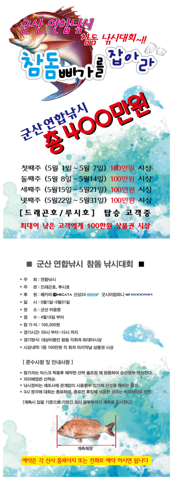 ![]() ![]() ![]() ![]() 부슬부슬 이슬비가 내리고 있습니다. 아침 참돔도 히트~~~~^^ [루시호/드래곤호] 자리여유 있습니다~ 연합낚시 참돔대회는 가타부타 조건 없습니다. 매주 빅원이 일등입니다. 50cm라도 그주 빅원이면 1등 시상합니다. 초 대박확률~!! 도전하시죠~~ ^^ 예약은 홈페이지에서 가능합니다~ ==== 루시호 예약안내 ======== 예 약 문 의 : 010-5711-4455 오 시 는 길 : 전라북도 군산시 비응남로71 비응항 (군산 연합낚시) 홈 페 이 지 : http://lucy.sunsang24.com http://lucyho.co.kr 네이버밴드 : [군산루시호] https://band.us/@seawolf 계좌안내 :기업은행:010-5711-4455 문장명 ![]() ◀== 군산 루시호는 최고의 선사가 되기위해 노력하겠습니다==▶ ★ 루시호 ![]() ⊙ 선명 : 군산 루시호 (20인승) ⊙ 장비 : 최신 해양프로타, 레이더, 어탐 및 VHF 무전기, 각종 법정장비 ⊙ 편의시설 : 방송장비, 오디오시스템, 화장실 ⊙ 안전장비 : 승선 정원의 120퍼센트에 해당하는 구명조끼, 구명부환, 소화기, 구명밧줄, 자기발연, 자기발화, 엔진자동 소화기 완전구비함. ⊙ 보험 : (유어선 관리법에 의해) 낚시객 승선정원 전원 보험가입 ★ 드래곤호 ![]() ⊙ 선명 : 군산 드래곤호 (20인승) ⊙ 장비 : 최신 해양프로타, 레이더, 어탐 및 VHF 무전기, 각종 법정장비 ⊙ 편의시설 : 방송장비, 오디오시스템, 화장실 ⊙ 안전장비 : 승선 정원의 120퍼센트에 해당하는 구명조끼, 구명부환, 소화기, 구명밧줄, 자기발연, 자기발화, 엔진자동 소화기 완전구비함. ⊙ 보험 : (유어선 관리법에 의해) 낚시객 승선정원 전원 보험가입 =================================================================#루시호 #군산루시호 #드래곤호 #군산드래곤호 #군산선상낚시 #군산낚시배 #군산배낚시 #비응항 #참돔 #참돔타이라바 #타이라바 #군산참돔 #광어다운샷 #군산광어 #광어선상낚시 #광어배낚시 #광따 #농어생미끼 #군산농어 #농어외수질 #생미끼 #군산생미끼 #외수질 #군산외수질낚시 #생새우낚시 #오징어 #군산참돔낚시 #참돔타이라바 #문어 #대왕문어 #돌문어 #군산쭈꾸미낚시 #주꾸미낚시 #군산쭈꾸미 #군산문어낚시 #갑오징어 #군산갑오징어 #갑돌이 #갑오징어선상 #군산갑오징어낚시 #연합낚시 #군산연합낚시 |